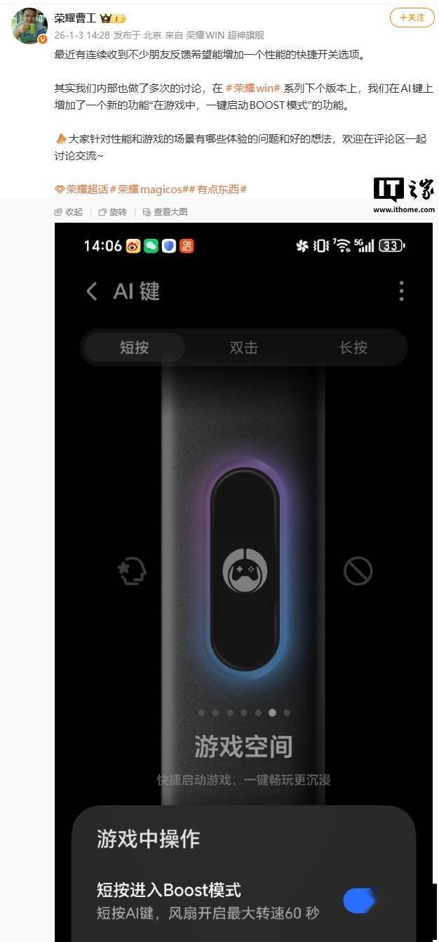 IT之家 1 月 3 日动静,但愿能为 WIN 系列手机添加一个机能的快速开关选项。为 AI 键新增“逛戏中一键启动 BOOST 模式”功能。最终决定正在 WIN 系列的下个版本中,这项功能能够正在逛戏中短按 AI 键。