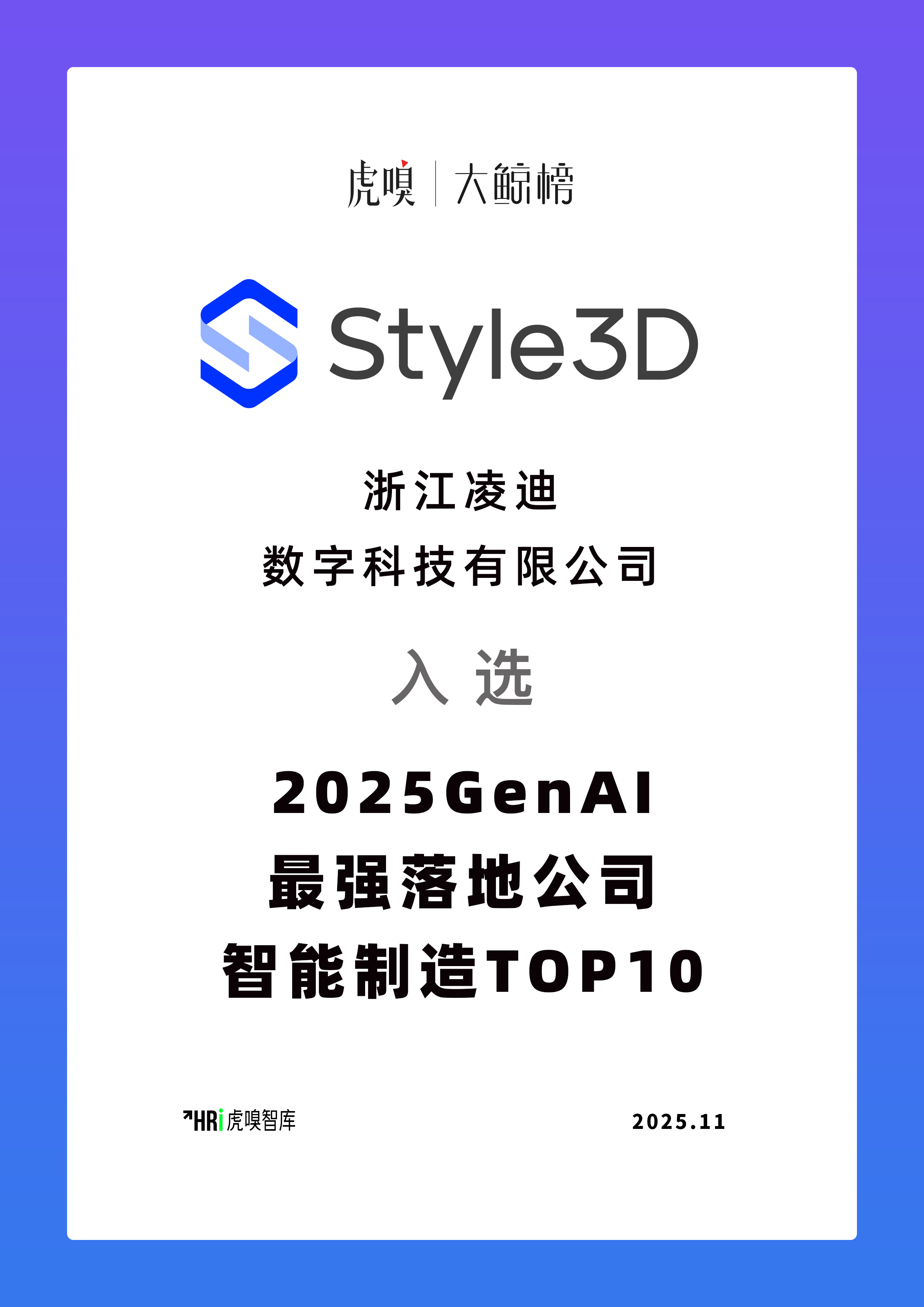 “财产落地”,鞭策整个行业的数字化转型取升级。基于外行业内的普遍使用及立异实力,Style3D凭仗正在时髦财产的高效落地使用,”本年。荣获「2025GenAI最强落地公司—智能制制TOP10」项。实现从灵感应出产的全链智能化沉构。